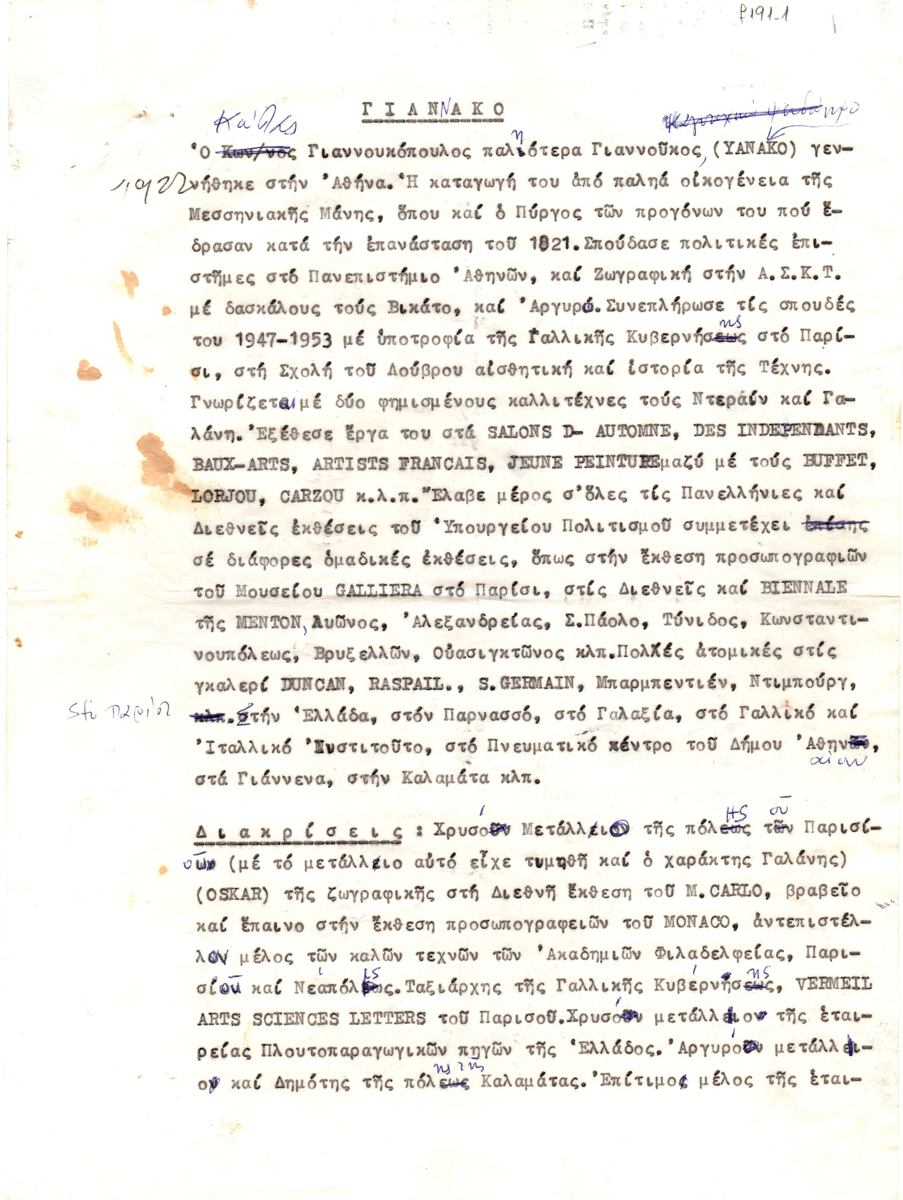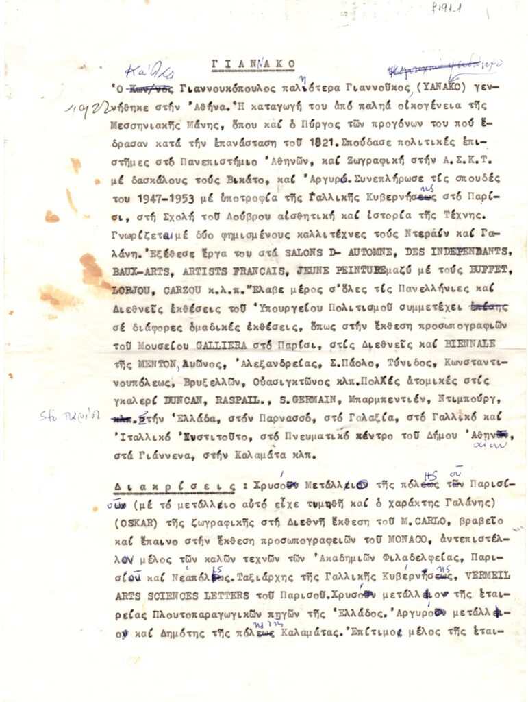 Βιογραφικό, δακτυλόγραφο, χαρτί, 3φφ, 29×21 εκ., στα ελληνικά, δημοσίευσης του Κωνσταντίνου Γιαννακόπουλου. Περιέχει διακρίσεις, μέρη όπου βρίσκονται τα έργα του και βιβλιογραφία.