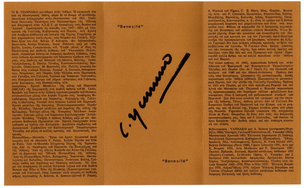 Έντυπο, χαρτόνι τρίπτυχο, 21,5×11,5 εκ., στα ελληνικά και ισπανικά, τιμητικής ατομικής έκθεσης ζωγραφικής του Κωνσταντίνου Γιαννακόπουλου, η οποία διεξάγεται στο Ισπανικό Επιμορφωτικό Ίδρυμα της Ισπανικής Πρεσβείας Αθηνών, το 1984. Το έντυπο περιέχει βιογραφικό του καλλιτέχνη.