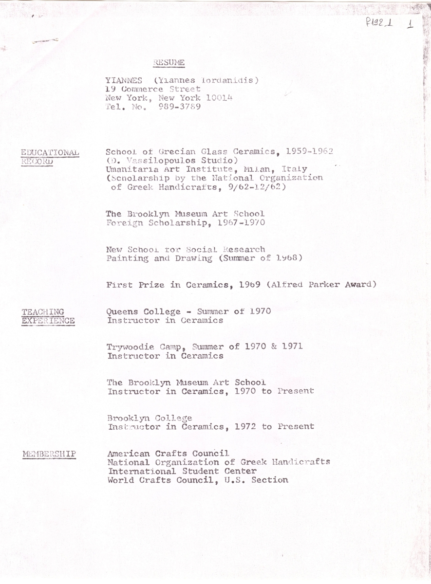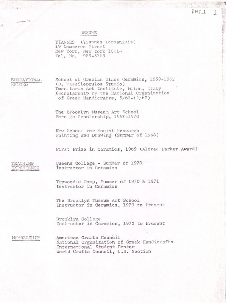 Φωτοαντίγραφο δακτυλόγραφου βιογραφικού, χαρτί, 3 φφ, 28×21,5 εκ., στα αγγλικά, του Γιάννη Ιορδανίδη. Περιέχει σπουδές, διδακτική εμπειρία, συμμετοχές, εκθέσεις, διαλέξεις/ workshops, εκδόσεις.