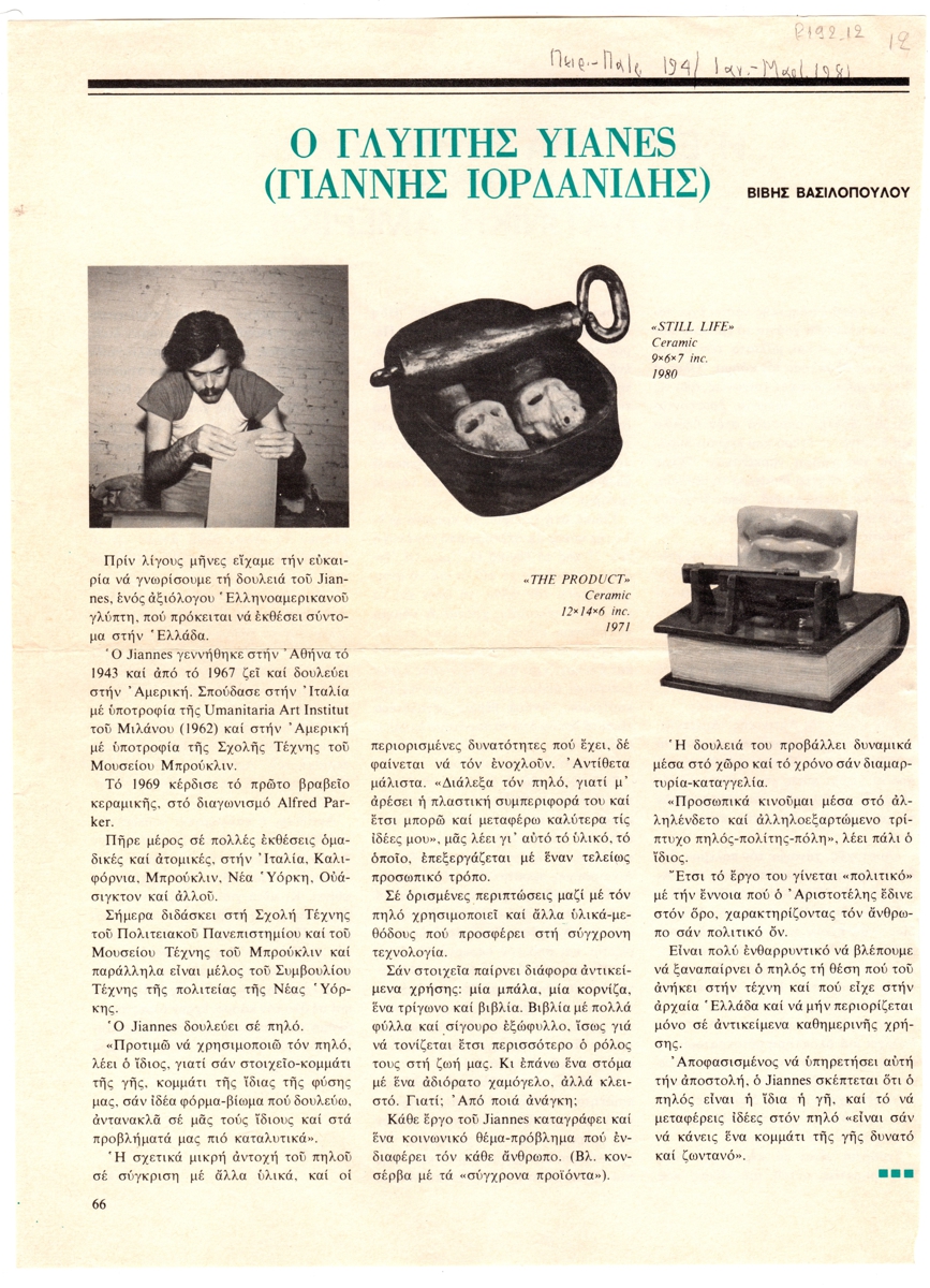 Απόκομμα, χαρτί, 30×22 εκ., στα ελληνικά, δημοσίευσης άρθρου για τον Γιάννη Ιορδανίδη.