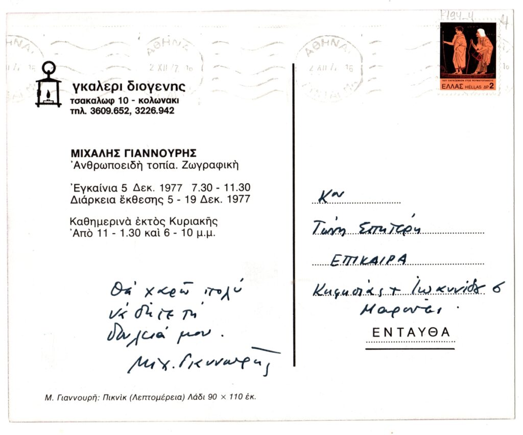 Πρόσκληση, χαρτόνι, 16×20 εκ., στα ελληνικά, ατομικής έκθεσης ζωγραφικής του Μιχάλης Γιαννουρής στην γκαλερί Διογένης το 1977.