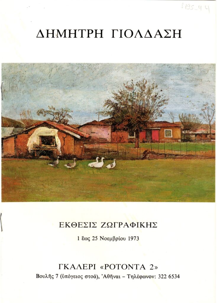 Έντυπο, χαρτί ιλλουστρασιόν, 4 φφ, 24×17 εκ., στα ελληνικά, ατομικής έκθεσης ζωγραφικής του Δημήτρη Γιολδάση. Περιέχει βιογραφικό του καλλιτέχνη, κείμενο (κριτική) του Ζαχαρία Παπαντωνίου, κατάλογο έργων που παρουσιάζονται και εικονογράφηση.
