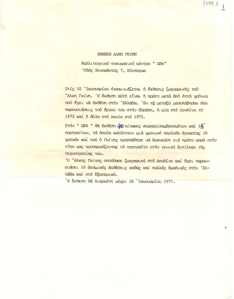 Δελτίο Tύπου, δακτυλόγραφο, χαρτί, 28,5×21,3 εκ., στα ελληνικά, ατομικής έκθεσης ζωγραφικής του Άλκη Γκίνη, η οποία διεξάγεται στο Καλλιτεχνικό Πνευματικό Κέντρο Ώρα στην Αθήνα.
