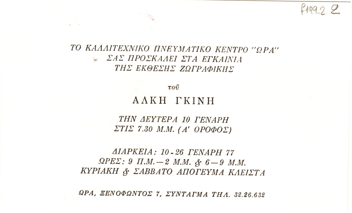 Πρόσκληση, χαρτόνι, 11×16 εκ., στα ελληνικά, ατομικής έκθεσης ζωγραφικής του Άλκη Γκίνη, η οποία διεξάγεται στο Καλλιτεχνικό Πνευματικό Κέντρο Ώρα στην Αθήνα το 1977.