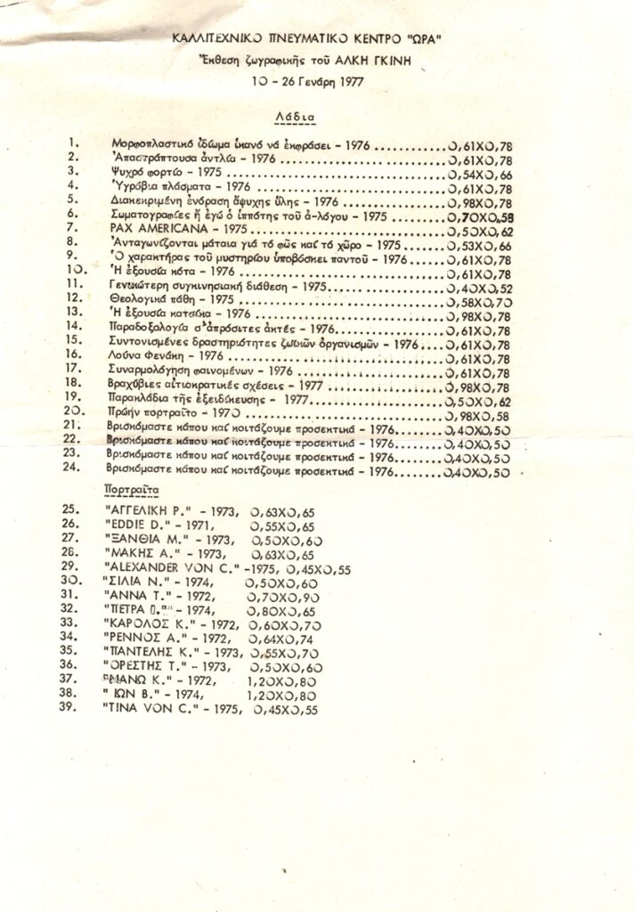 Κατάλογος έργων, χαρτί, 33,5×22 εκ., στα ελληνικά, του Άλκη Γκίνη, η οποία διεξάγεται στο Καλλιτεχνικό Πνευματικό Κέντρο Ώρα, στην Αθήνα το 1977.