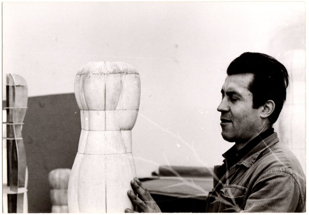Φωτογραφία, α/μ, σε φωτογραφικό χαρτί, 15,0×10,5 εκ. Ο γλύπτης Ιωάννης Αβραμίδης μπροστά σε έργο του,