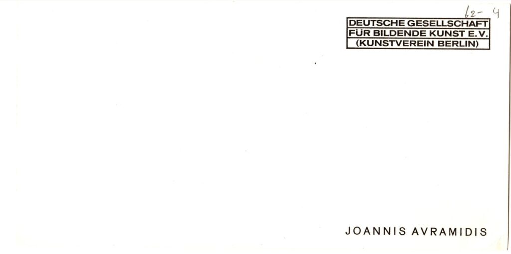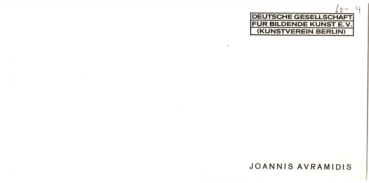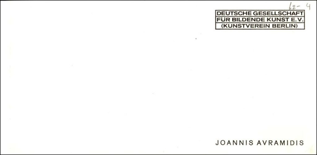 Έντυπο, στα γερμανικά, μονόφυλλο, χαρτόνι, 10,5×21 εκ., δύο όψεις. Πρόσκληση έκθεσης του Ιωάννη Αβραμίδη στο Βερολίνο. Η έκθεση διοργανώθηκε από την Deutschen Gesellschaft für Bildende Kunst e.V. Στα εγκαινία πραγματοποιήθηκε ομιλία του Herbert Freiherr Von Buttlar.