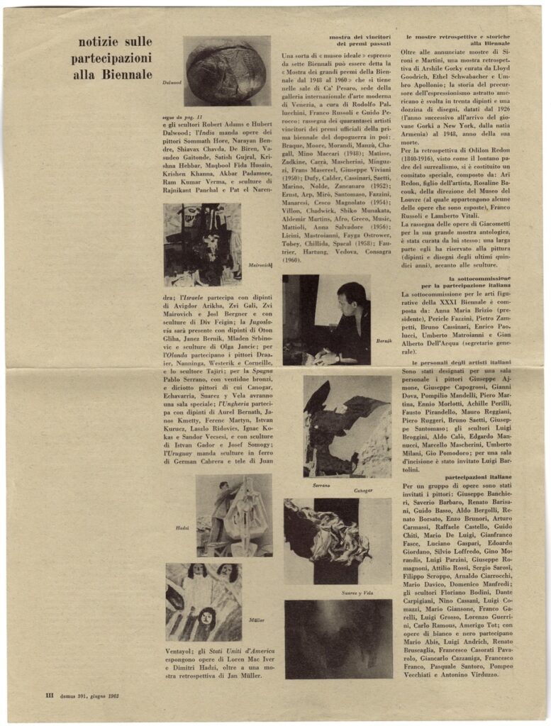Απόκομμα, έντυπο, χαρτί, 32,0×24,5 εκ., όπου δημοσιεύεται, στα ιταλικά, απόσπασμα άρθρου με αναφορά σε διάφορες εκθέσεις που διοργανώθηκαν στα πλαίσια της 31ης Biennale Βενετίας το 1962, πορτραίτα καλλιτεχνών και αναπαραγωγές έργων.