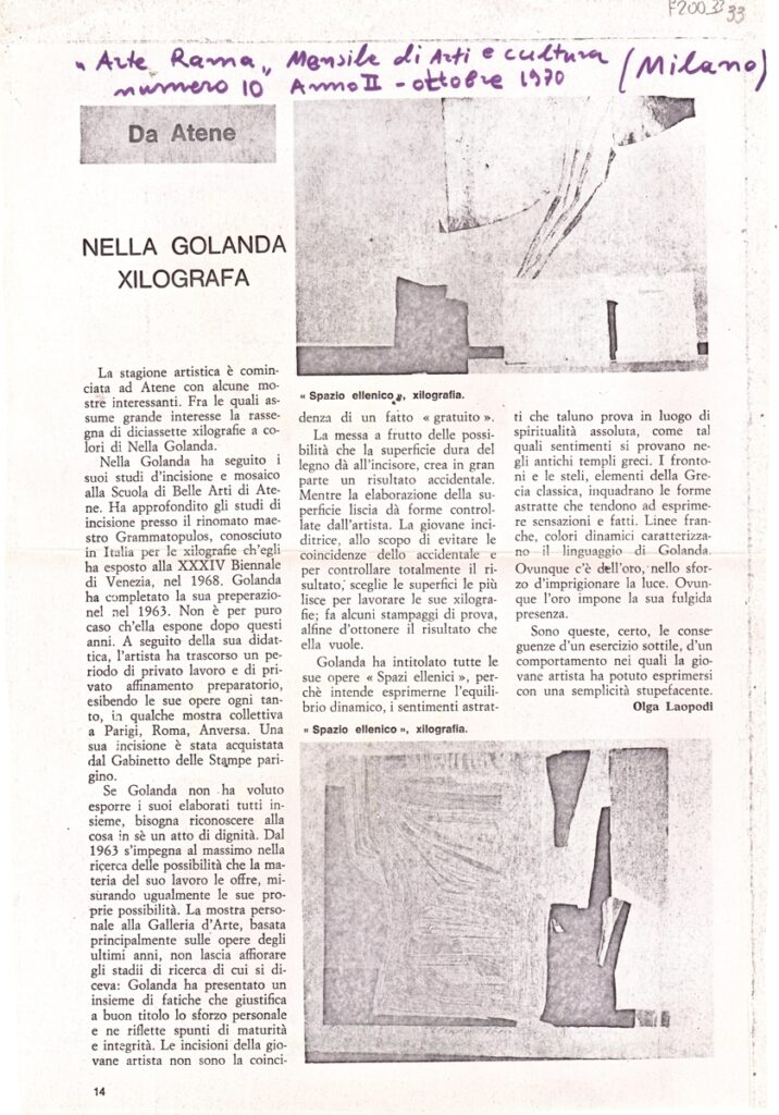 Φωτοαντίγραφο, χαρτί, 28,5×19,5 εκ., στα ιταλικά, δημοσίευσης κριτικής έκθεσης της Νέλλας Γκολάντα στην Αθήνα.