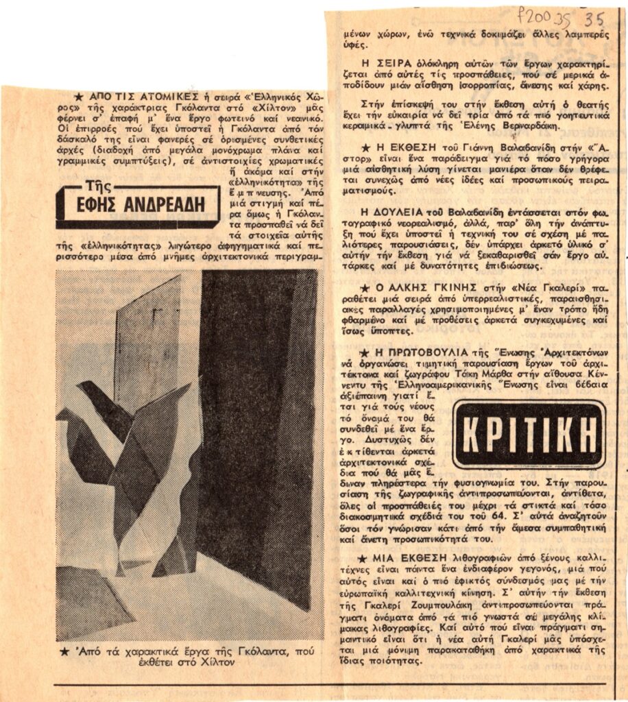 Απόκομμα, χαρτί, 17,5×16 εκ., στα ελληνικά, δημοσίευσης κριτικών εκθέσεων των Νέλλας Γκολάντα, Γιάννη Βαλαβανίδη, Ελένης Βερναδάκη, Άλκη Γκίνη, τιμητική έκθεση στη μνήμη Τάκη Μάρθα, έκθεση λιθογραφιών ξένων καλλιτεχνών. Διεξάγονται αντίστοιχα στην αίθουσα Χίλτον, Γκαλερί Άστορ, Νέα Γκαλερί, Αίθουσα Κέννεντυ Ελληνοαμερικανικής Ένωσης και Γκαλερί Ζουμπουλάκη. Εντάσσεται στη στήλη “Κριτική” του εντύπου και εικονογραφείται.