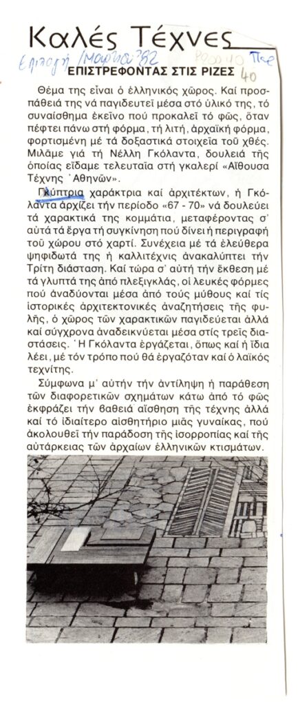 Απόκομμα, χαρτί ιλλουστρασιόν, 18×7,5 εκ., στα ελληνικά, δημοσίευσης κριτικής έκθεσης της Νέλλας Γκολάντα, η οποία διεξάγεται στην Αίθουσα Τέχνης Αθηνών το 1982. Εντάσσεται στη στήλη “Καλές Τέχνες”, εικονογραφείται και φέρει επιγραφές.