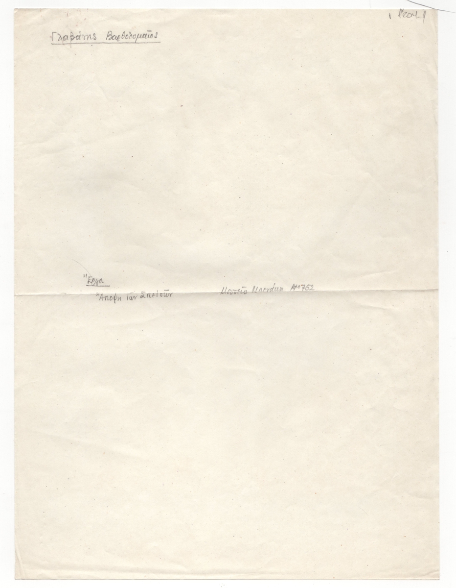 Κείμενο, χειρόγραφο, στα ελληνικά, σε φύλλο χαρτιού, 28,8×21,5 εκ., στα ελληνικά. Σημείωση με τίτλο έργου του καλλιτέχνη που βρίσκεται στο Μουσείο Μπενάκη στην Αθήνα.