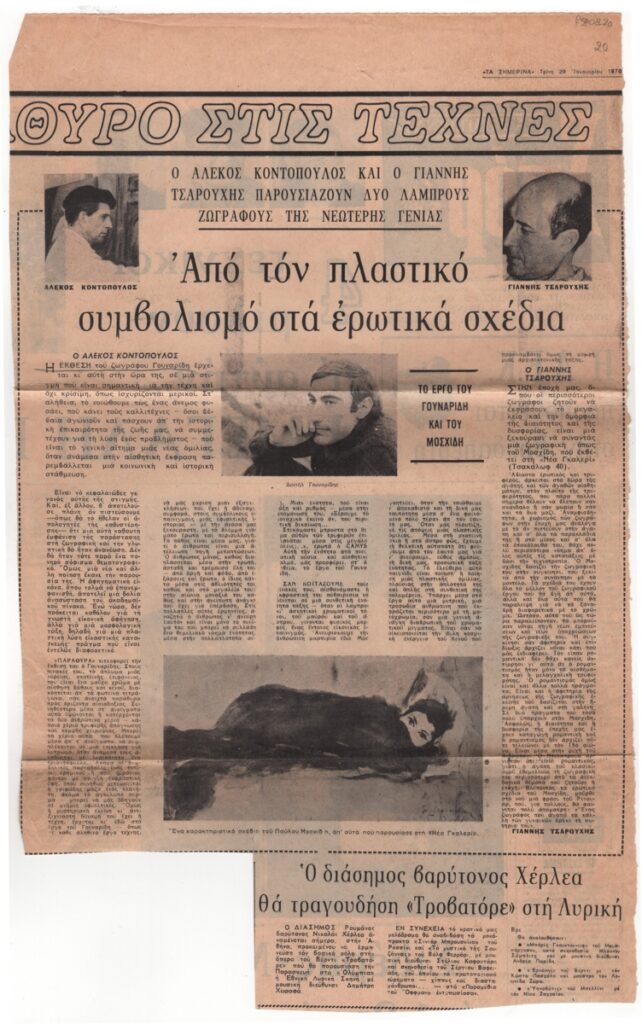 Απόκομμα εφημερίδας, χαρτί, 41,0×25,2 εκ., στα ελληνικά. Ο Αλέκος Κοντόπουλος και ο Γιάννης Τσαρούχης παρουσιάζουν το έργο του Γουναρίδη και του Μοσχίδη. Το δημοσίευμα εικονογραφείται με φωτογραφίες των συντελεστών και αναπαραγωγή έργου του Μοσχίδη.