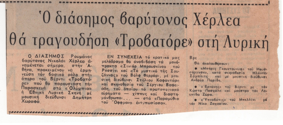 Απόκομμα εφημερίδας, χαρτί, 41,0×25,2 εκ., στα ελληνικά. Το δημοσίευμα αφορά τη συμμετοχή του διάσημου βαρύτονου N. Herlea στον βασικό ρόλο στην όπερα του Βέρντι “Τροβατόρε”, που θα ανεβάσει η Εθνική Λυρική Σκηνή σε διεύθυνση του Δημήτρη Χωραφά. Αναγγέλονται επίσης οι παραστάσεις: “Σινιόρ Μπρουσκίνο” του Ροσσίνι και “Το μυστικό της Σουζάννας” του Βολφ-Φερράρι, “Μπορίς Γκουντούνωφ” του Μουσόργκσκι, “Ερνάνης” του Βέρντι και “Υπνοβάτις” του Μπελλίνι.