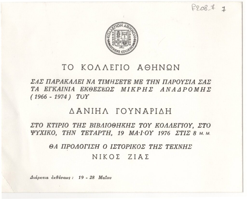 Έντυπο, μονόφυλλο, χαρτόνι, 11,5×14,5 εκ., στα ελληνικά. Αφορά αναδρομική έκθεση του καλλιτέχνη στην Αθήνα το 1976 με έργα της περιόδου 1966-1974. Προλογίζει ο Ν. Ζίας.
