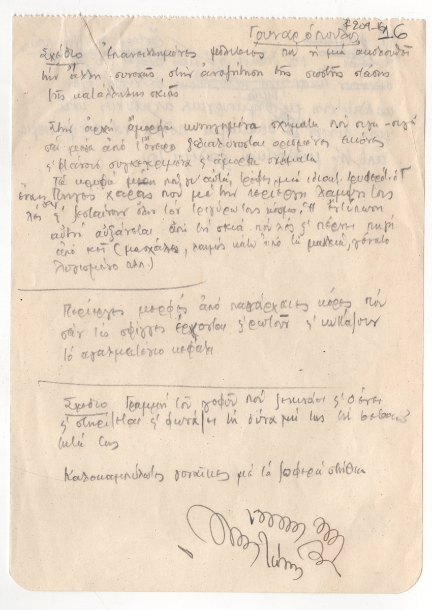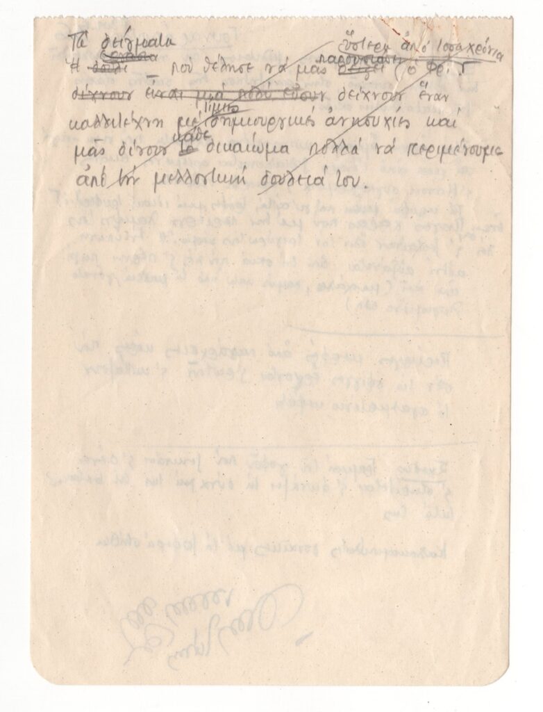 Κείμενο, χειρόγραφο, με μολύβι, σε απόκομμα χαρτιού, 18,8×13,5 εκ., στα ελληνικά. Κριτική του Τώνη Σπητέρη (;) για το έργο του καλλιτέχνη.
