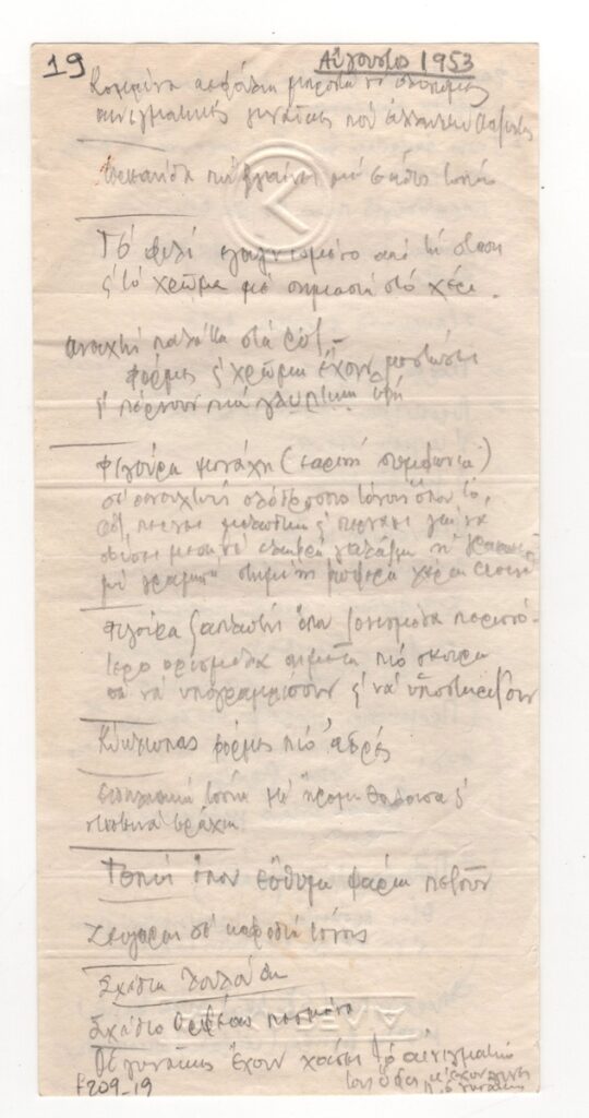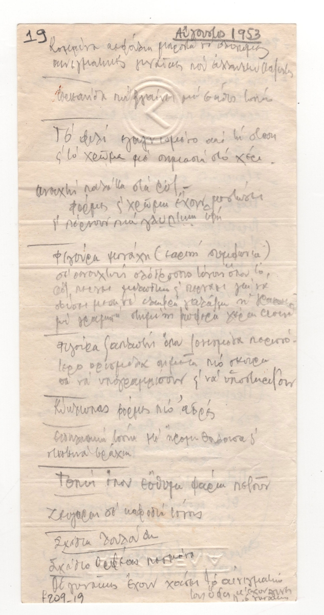 Κείμενο, χειρόγραφο, με μολύβι, στα ελληνικά, σε χαρτί, 18,2×8,2 εκ. Κριτική του Τώνη Σπητέρη για το έργο του καλλιτέχνη με σχολιασμό και συγκεκριμένων έργων. Πιθανόν οι σημειώσεις κρατήθηκαν κατά την επίσκεψη σε έκθεση έργων του καλλιτέχνη. Έχουν καταγραφεί σε χαρτί από πακέτο τσιγάρων της καπνοβιομηχανίας ΚΑΡΕΛΙΑ