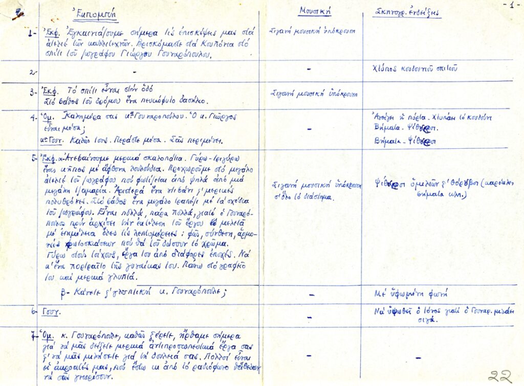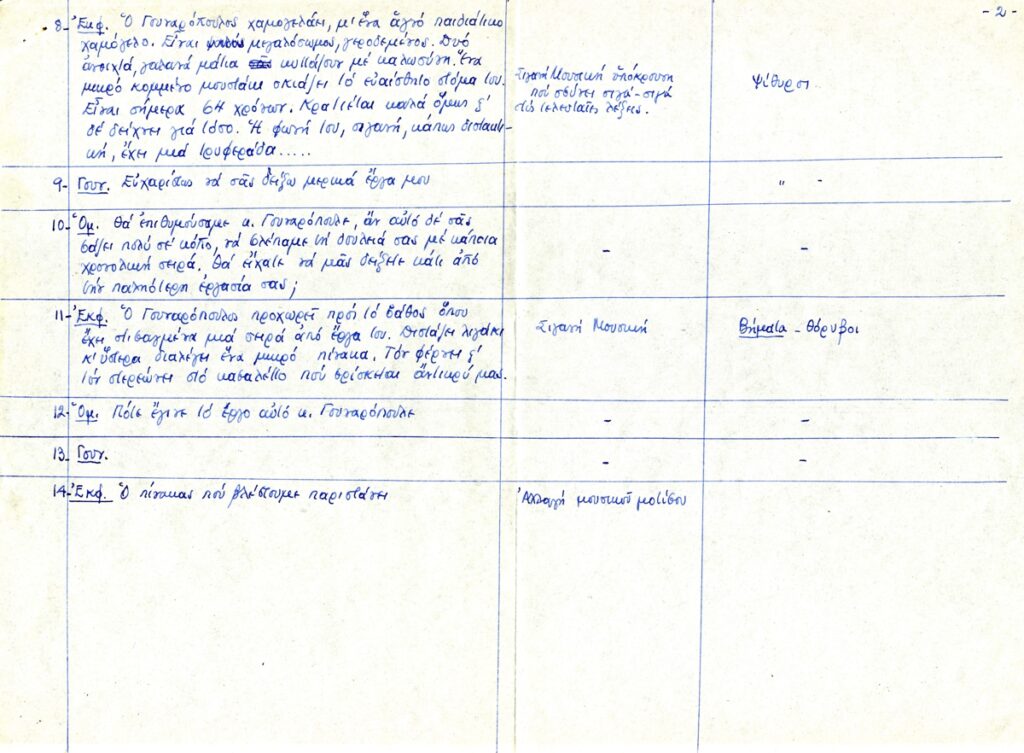 Κείμενο, χειρόγραφο, με μπλε μελάνι, στα ελληνικά, σε χαρτί, 4 φφ, 21,3×29,0 εκ`. Πίνακας-προσχέδιο ραδιοφωνικής εκπομπής με ερωτοαποκρίσεις, οδηγίες μουσικής και σκηνογραφικές ενδείξεις.