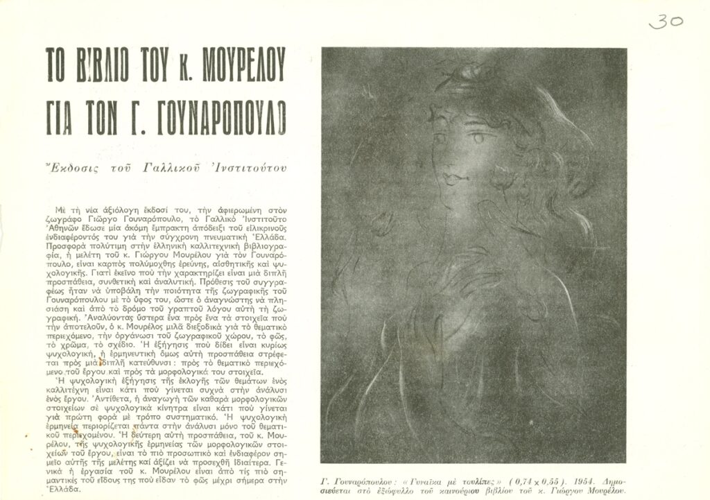 Απόκομμα περιοδικού, χαρτί, 17,4×24,3 εκ., στα ελληνικά. Δημοσίευμα με αφορμή την κυκλοφορία της μελέτης του Γ. Μουρέλο για τον καλλιτέχνη, που εκδόθηκε από το Γαλλικό Ινστιτούτο Αθηνών το 1956. Εικονογραφείται με αναπαραγωγή έργου.