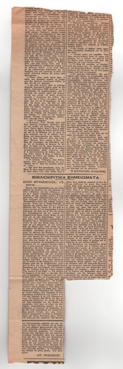 Απόκομμα εφημερίδας, χαρτί, 41,0×12,0 εκ., στα ελληνικά. Απόσπασμα κριτικής της νέας ποιητικής συλλογής του Ν. Εγγονόπουλου με τίτλο “Έλευσις”. Εντάσσεται στη στήλη “Βιβλιοκριτικά σημειώματα”.