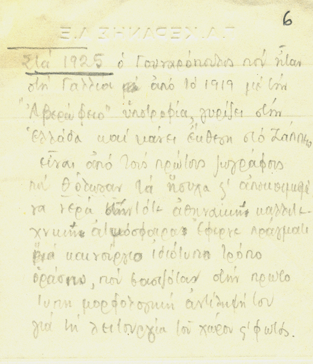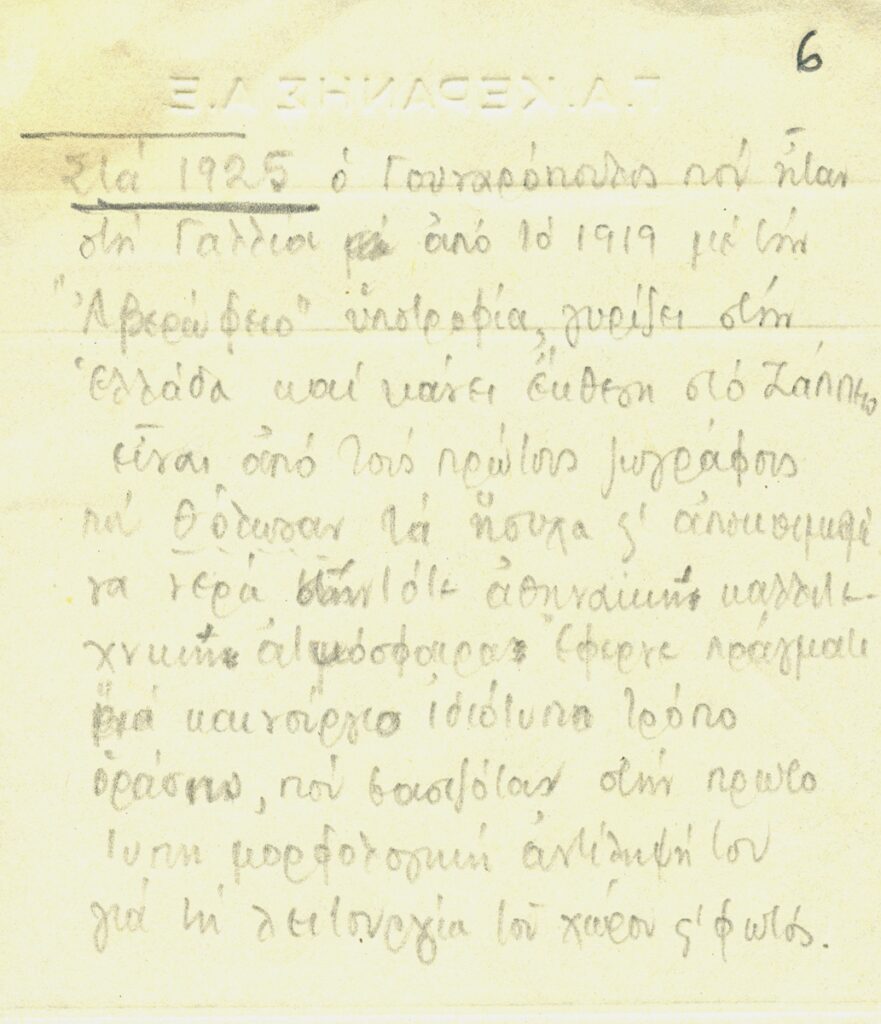 Κείμενο, χειρόγραφο, με μολύβι, σε απόκομμα χαρτιού, 10,9×9,9 εκ., στα ελληνικά. Το κείμενο αφορά τη δράση του Γ. Γουναρόπουλου κατά το έτος 1925 και κριτική του έργου της περιόδου. Το κείμενο είναι γραμμένο πάνω σε χαρτί από τσιγάρα της καπνοβιομηχανίας Π.Α. ΚΕΡΑΝΗΣ Α.Ε.