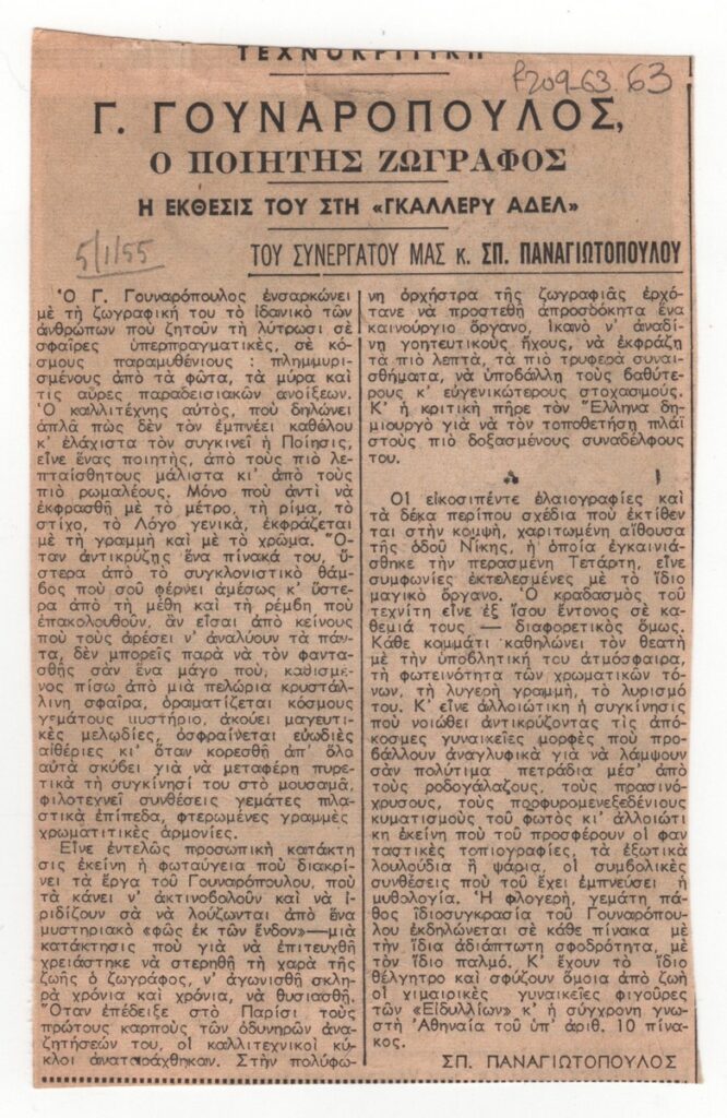 Απόκομμα εφημερίδας (05/01/1955). Κριτική της έκθεσης ζωγραφικής του καλλιτέχνη στην Αθήνα.
