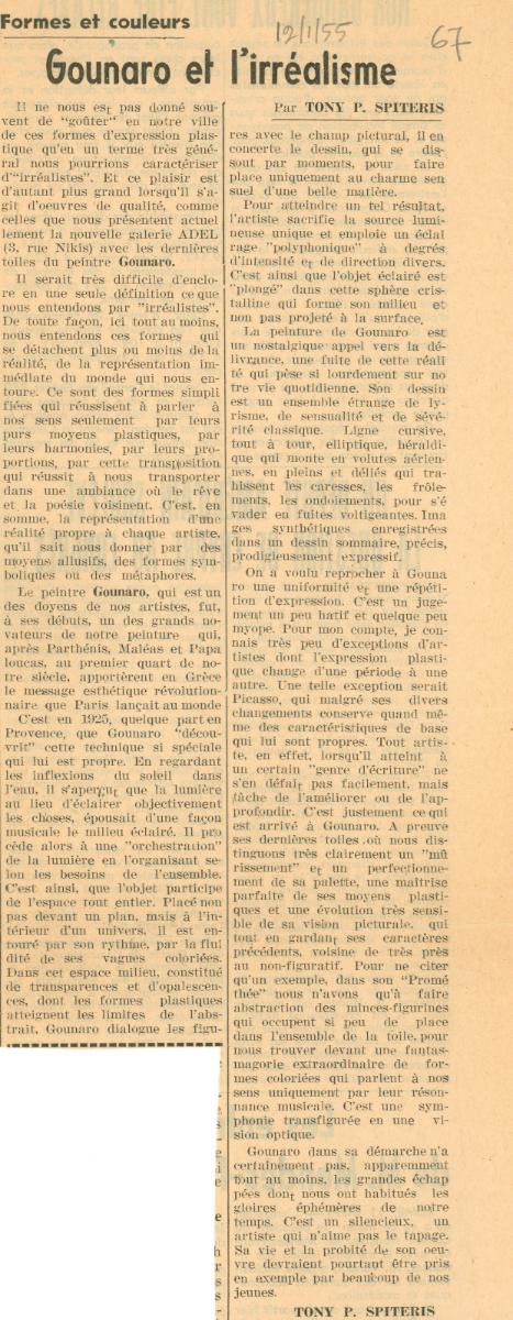 Απόκομμα εφημερίδας (12/01/1955). Κριτική της έκθεσης ζωγραφικής του καλλιτέχνη στην Αθήνα.