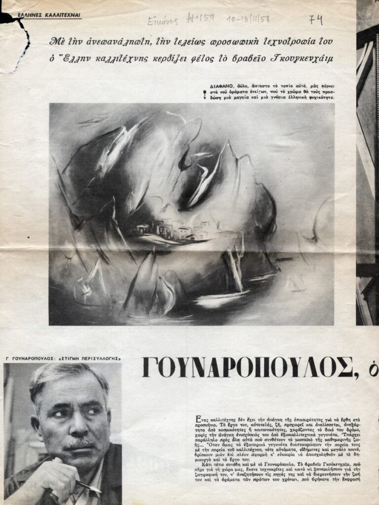 Απόκομμα του περιοδικού “Εικόνες” (10/11/1958). Άρθρο για τον καλλιτέχνη με αφορμή τη βράβευσή του το 1958 με το βραβείο Γκούγκενχάιμ. Περιέχει βιογραφικά στοιχεία και κριτική του έργου του.