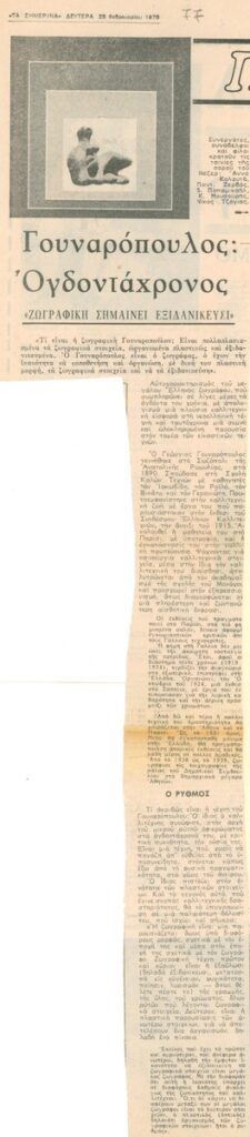 Απόκομμα της εφημερίδας “Τα Σημερινά” (23/02/1970). Κείμενο για την αντίληψη του Γ. Γουναρόπουλου για την ζωγραφική του και την έννοια του ρυθμού στο έργο του.