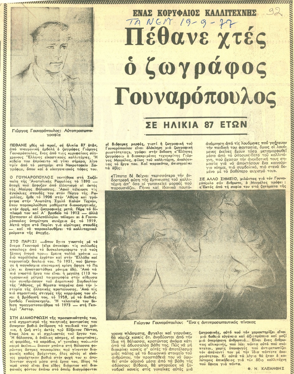 Απόκομμα της εφημερίδας “Τα Νέα” (19/08/1977). Άρθρο για τον καλλιτέχνη από τον Φ. Ν. Κλεάνθη με αφορμή το θάνατό του καλλιτέχνη. Εικονογραφείται με αναπαραγωγή δύο έργων του καλλιτέχνη.