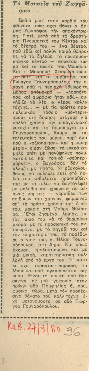Απόκομμα της εφημερίδας “Η Καθημερινή” (27/03/1980). Δημοσίευμα με αφορμή την ίδρυση του Μουσείου Γουναρόπουλου στου Ζωγράφου.