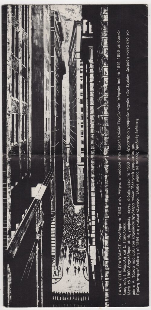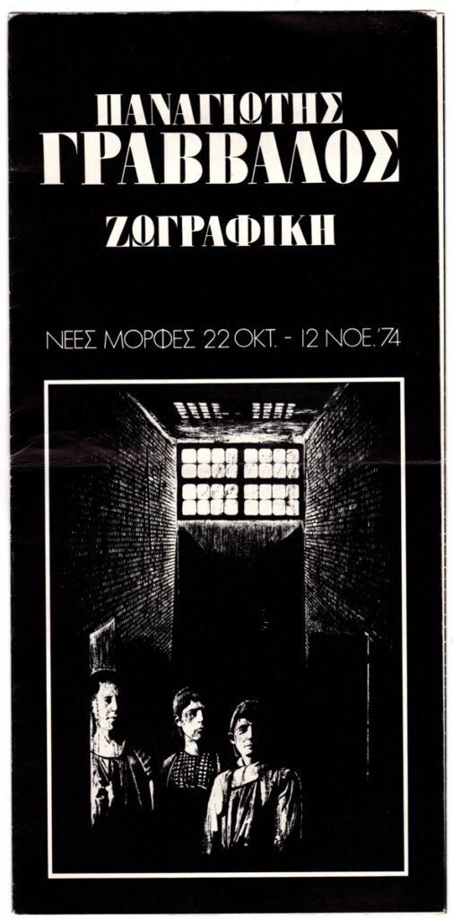 Έντυπο, χαρτί ιλλουστρασιόν δίπτυχο, 31×15 εκ., στα ελληνικά, ατομικής έκθεσης ζωγραφικής του Παναγιώτη Γράββαλου, η οποία διεξάγεται στην γκαλερί Νέες Μορφές στην Αθήνα. Περιέχει κείμενο του Μάριου Πλωρίτη για το έργο του καλλιτέχνη, σύντομο βιογραφικό σημείωμα και εικονογράφηση.