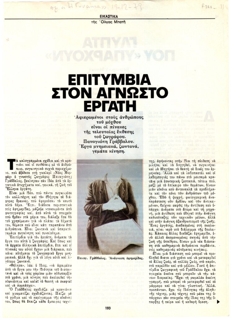 Απόκομμα, χαρτί, 30×21,5 εκ., στα ελληνικά, δημοσίευσης κριτικής έκθεσης του Παναγιώτη Γράββαλου, η οποία διεξάγεται στην γκαλερί Νέες Μορφές στην Αθήνα.