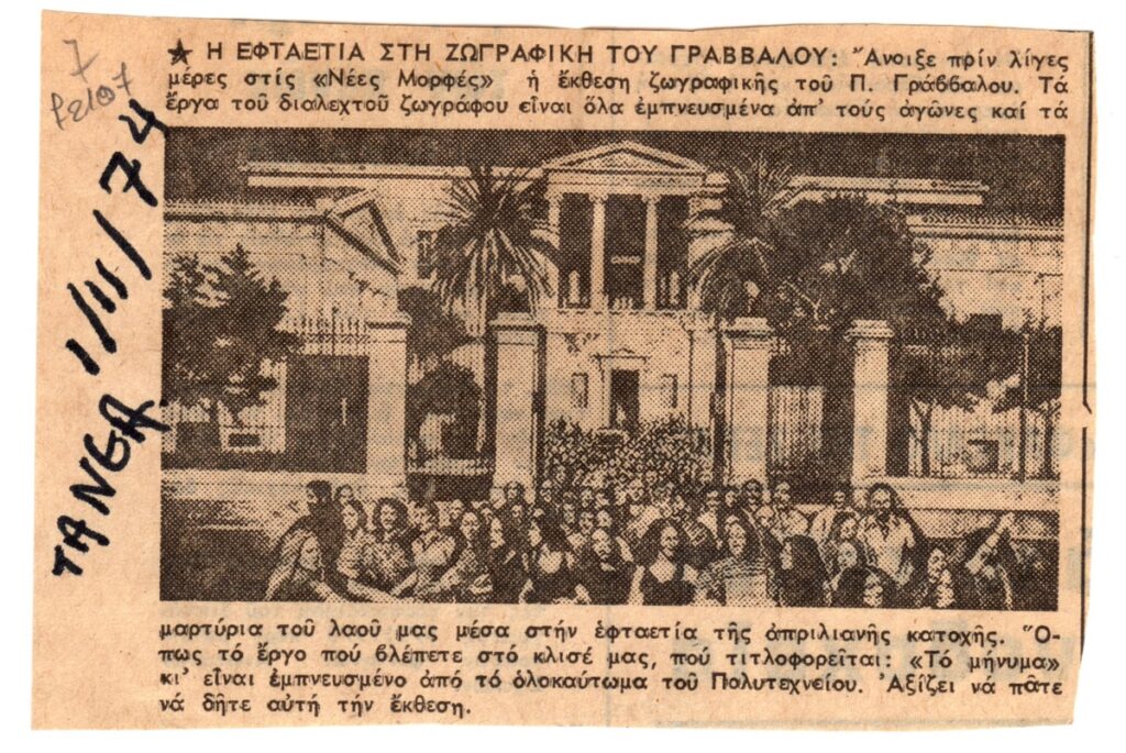 Απόκομμα, χαρτί, 7,5×11,5 εκ., στα ελληνικά, δημοσίευσης κριτικής έκθεσης του Παναγιώτη Γράββαλου, η οποία διεξάγεται στην Γκαλερί Νέες Μορφές στην Αθήνα το 1974.