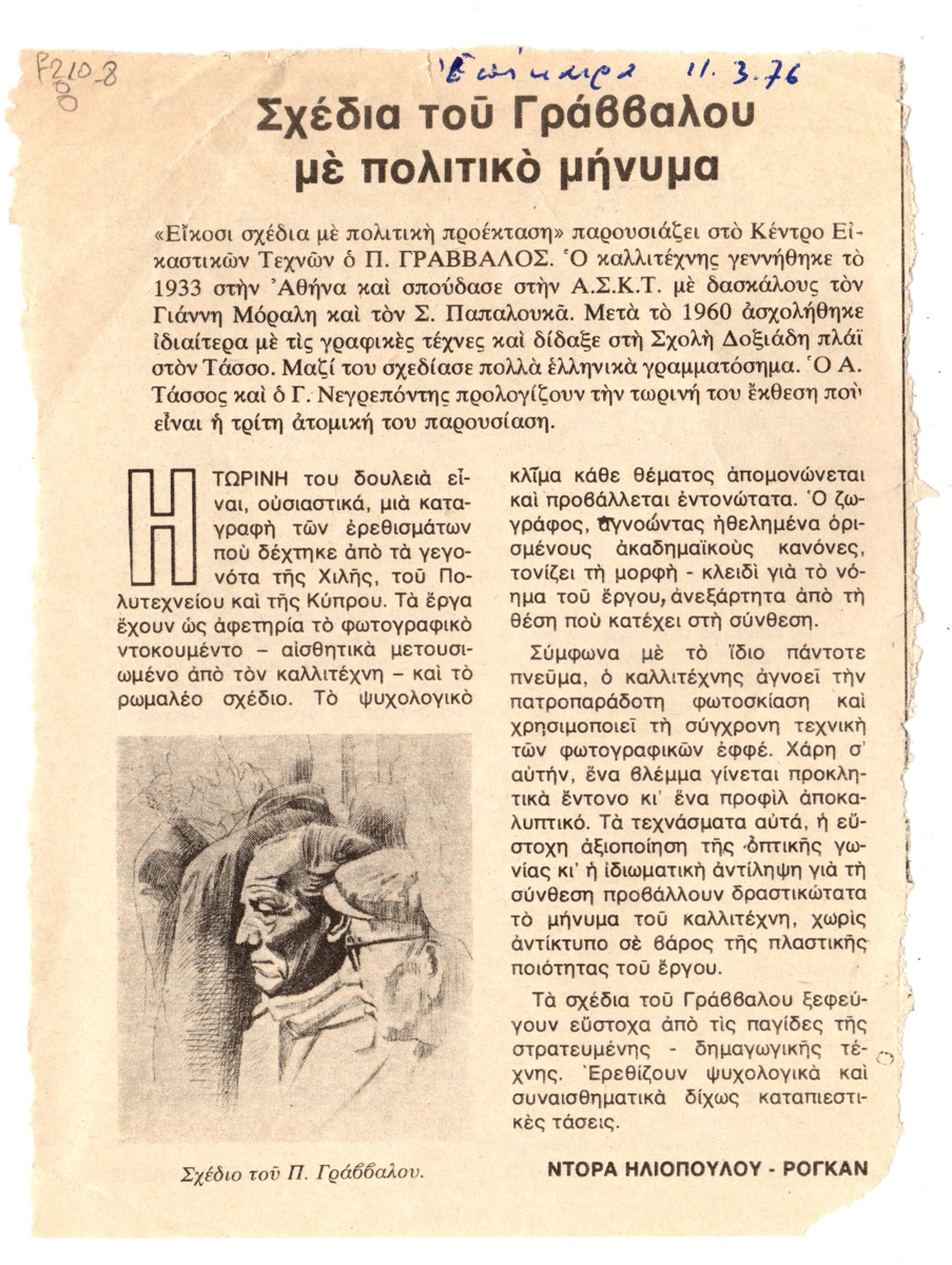 Απόκομμα, χαρτί, 16,5×12,5 εκ., στα ελληνικά, δημοσίευσης κριτικής έκθεσης του Παναγιώτη Γράββαλου, η οποία διεξάγεται στο Κέντρο Εικαστικών στην Αθήνα.