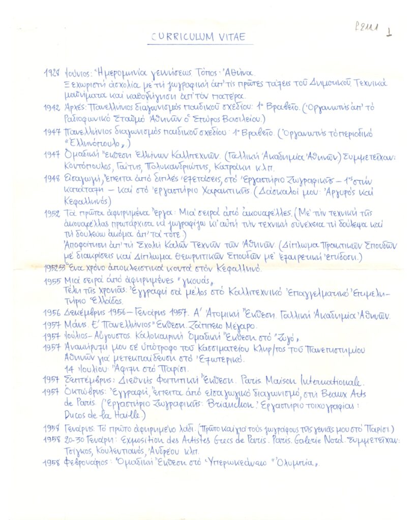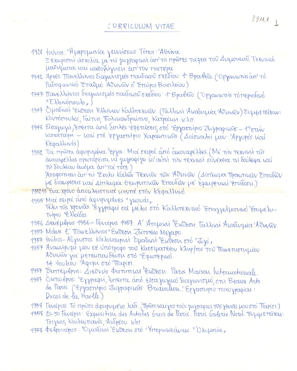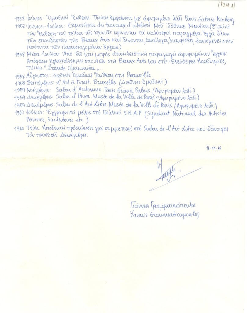 Βιογραφικό, χειρόγραφο, χαρτί, 2 φφ, 27×21 εκ., στα ελληνικά, του Γιάννη Γραμματικόπουλου. Περιέχει σε χρονολογική σειρά τα σημαντικοτερα γεγονότα της ζωής του.