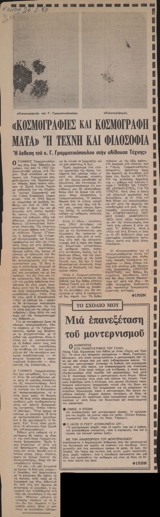 Απόκομμα, χαρτί, 47×16 εκ., στα ελληνικά, δημοσίευσης κριτικής έκθεσης του Γιάννη Γραμματικόπουλου, η οποία διεξάγεται στην Αίθουσα Τέχνης Αθηνών.