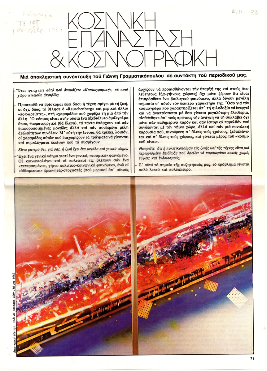 Απόκομμα, χαρτί ιλλουστρασιόν, 2 φφ, διπλής όψεως, δημοσίευσης συνέντευξης του Γιάννη Γραμματικόπουλου. Συμπληρώνεται από κείμενο για το έργο του.