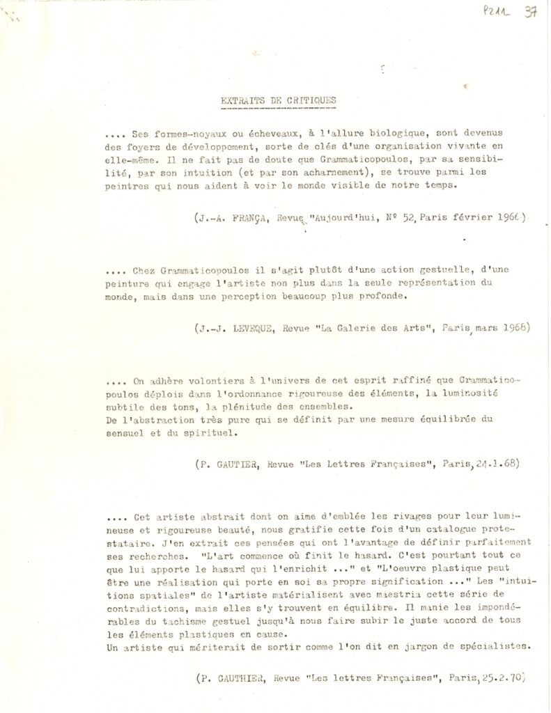 Δακτυλόγραφο, χαρτί, 3 φφ, 27,5×21,5 εκ., στα γαλλικά, με κριτικές στον γαλλικό Τύπο για το έργο του Γιάννη Γραμματικόπουλου.
