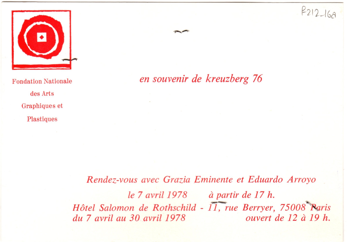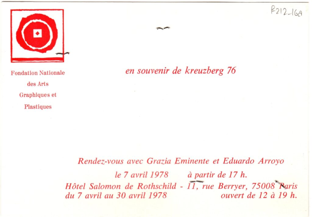 Πρόσκληση, χαρτόνι, 10,5×15 εκ., στα γαλλικά, ομαδικής έκθεσης των Grazia Eminente και Eduardo Arroyo, το 1978.