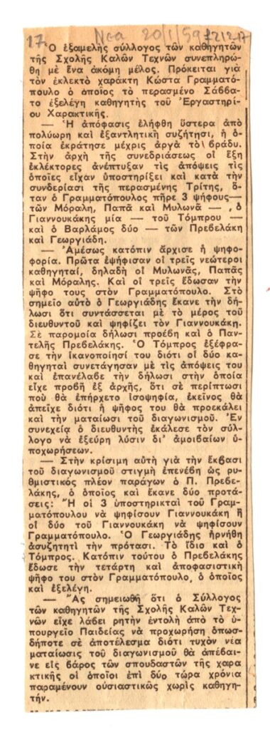 Απόκομμα, χαρτί, 14,5×5 εκ., στα ελληνικά, δημοσίευσης άρθρου το οποίο αναφέρεται στην εκλογή του Κώστα Γραμματόπουλου ως καθηγητή του Εργαστηρίου Χαρακτικής στην Σχολή Καλών Τεχνών.