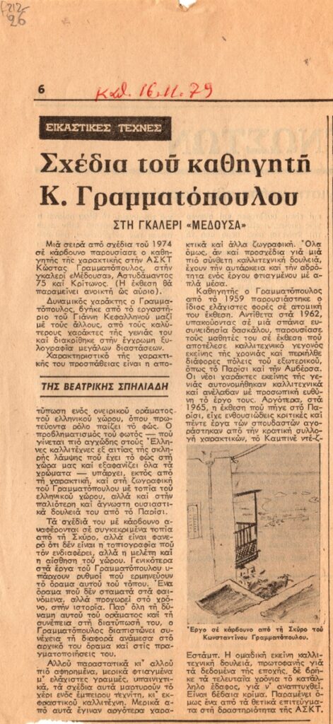Απόκομμα, χαρτί, 25×11,5 εκ., στα ελληνικά, δημοσίευσης κριτικής έκθεσης του Κώστα Γραμματόπουλου, η οποία διεξάγεται στην Γκαλερί Μέδουσα, στην Αθήνα. Εντάσσεται στη στήλη “Εικαστικά” του εντύπου. Το απόκομμα εικονογραφείται και φέρει επιγραφές.