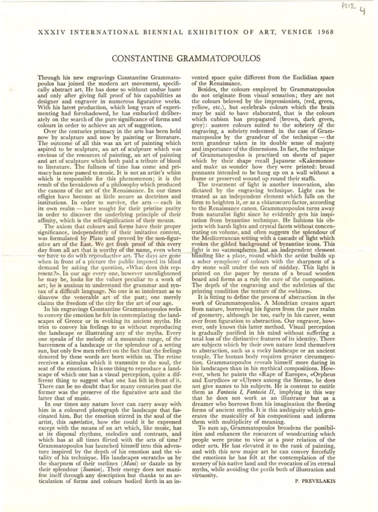 Έντυπο, χαρτί διπλής όψεως, 33×23,5 εκ., στα αγγλικά και ιταλικά, έκθεσης του Κώστα Γραμματόπουλου στο πλαίσιο της XXXIV Biennale di Venezia, 1968. Πρόκειται για κείμενο για τον καλλιτέχνη και το εκτιθέμενο εκεί έργο του.