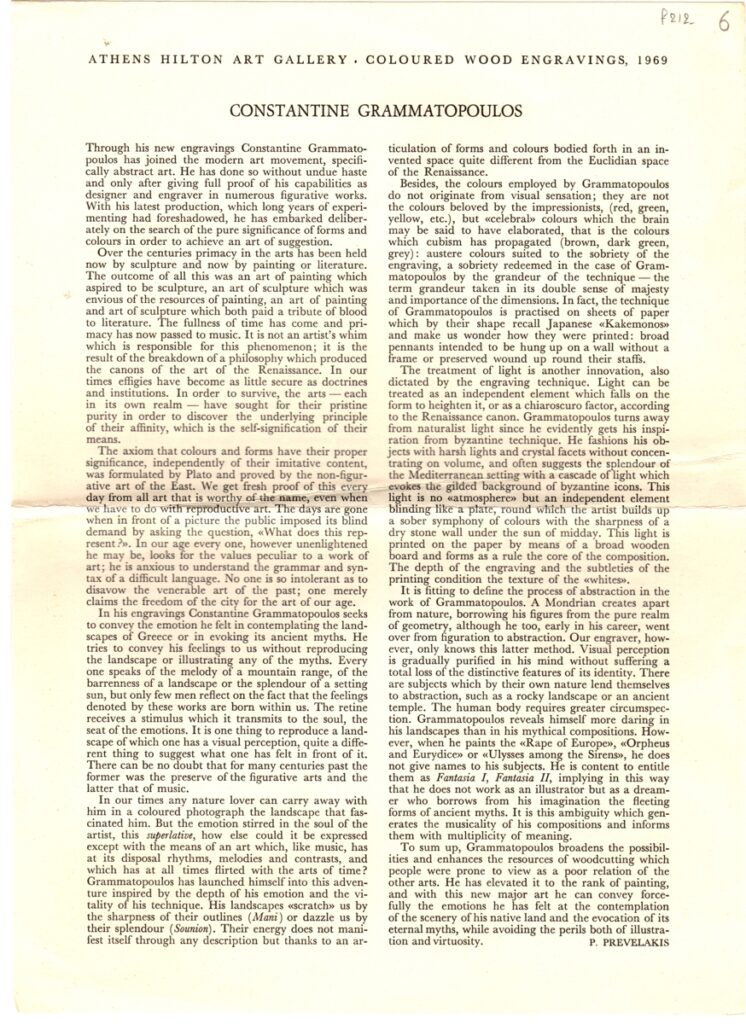 Έντυπο, χαρτί διπλής όψεως, 33×24 εκ., σε αγγλικά και γαλλικά, με κείμενο για τον Κωνσταντίνο Γραμματόπουλο και το έργο που παρουσιάζει σε ατομική του έκθεση στην Αίθουσα Τέχνης Χίλτον, το 1969.
