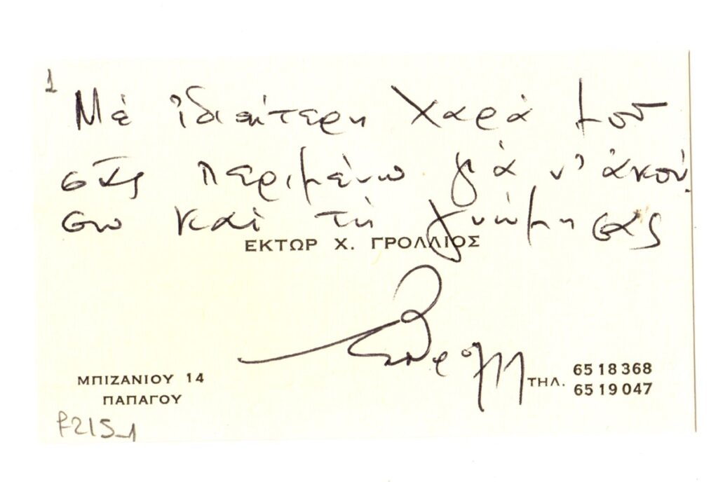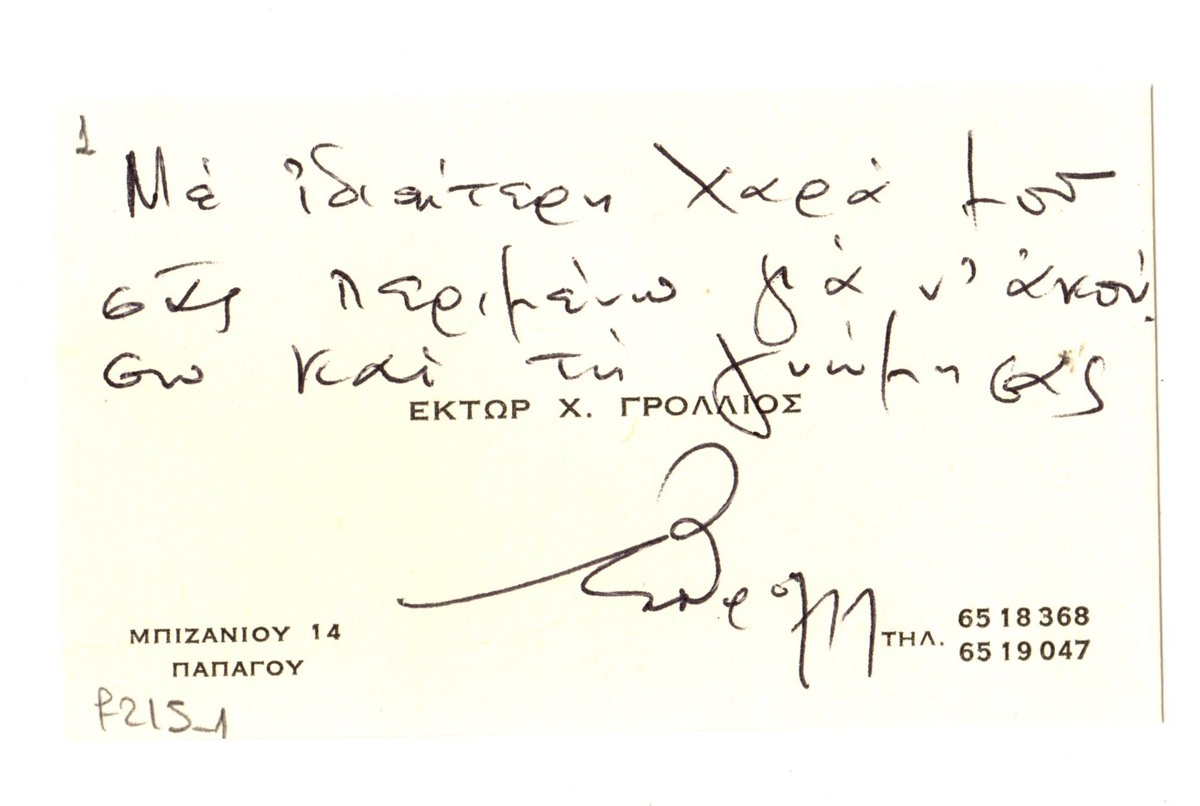 Επαγγελματική κάρτα, χαρτί, 5,5×10 εκ., του Έκτωρα Γρόλλιου.