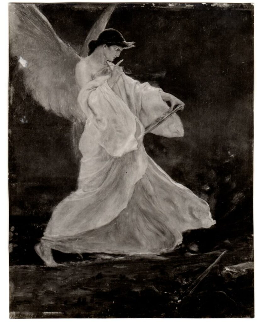 Ασπρόμαυρη εκτυπωμένη φωτογραφία έργου του Νικόλαου Γύζη. Η πίσω όψη φέρει επιγραφές.