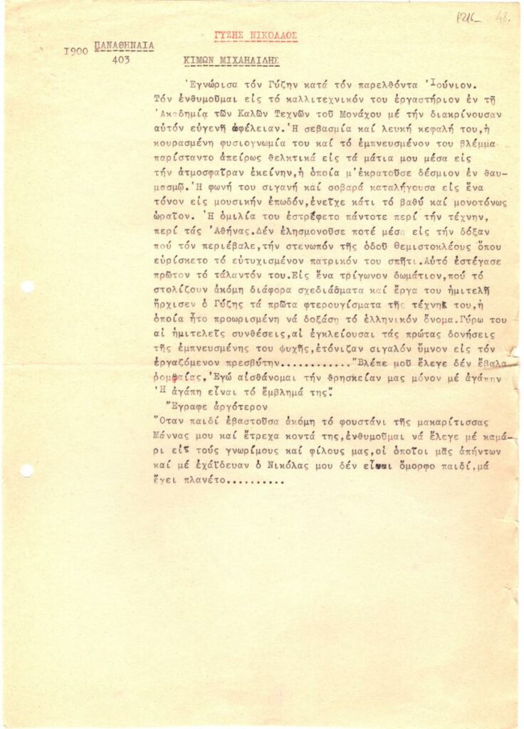 Δακτυλόγραφη αποδελτίωση κειμένου για τον Νικόλαο Γύζη. Προέρχεται από δημοσίευση στο περιοδικό “Παναθήναια” το 1900.
