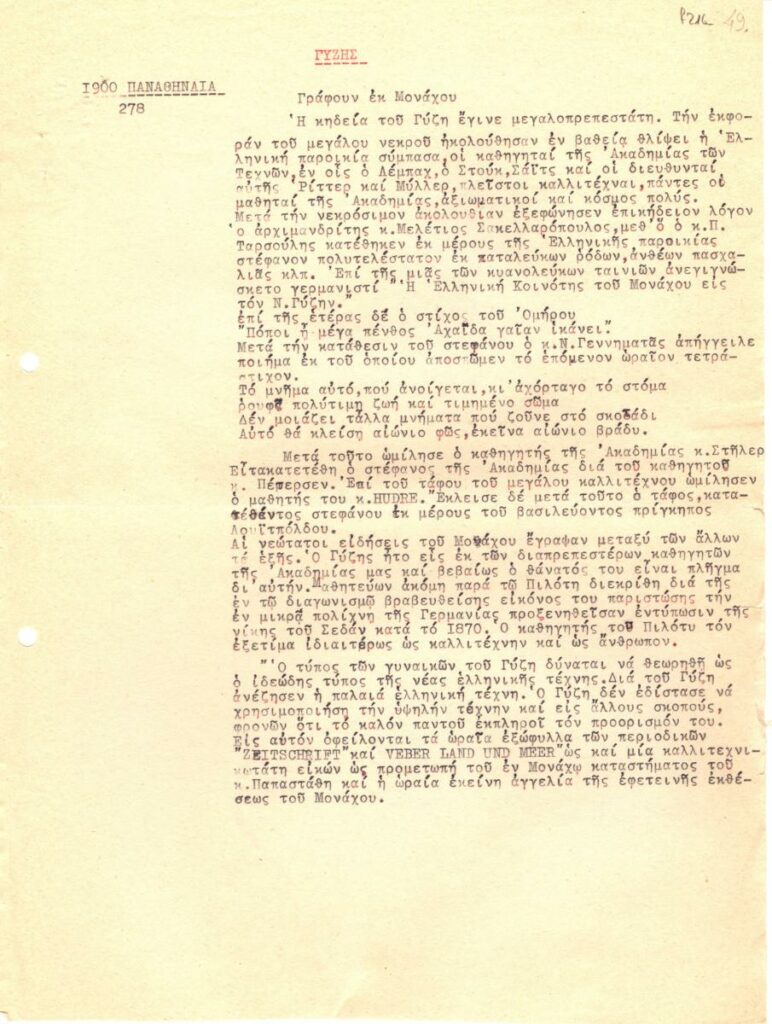 Δακτυλόγραφη αποδελτίωση δημοσιεύματος για την κηδεία του Νικόλαου Γύζη. Προέρχεται από το περιοδικό Παναθήναια, το 1900.