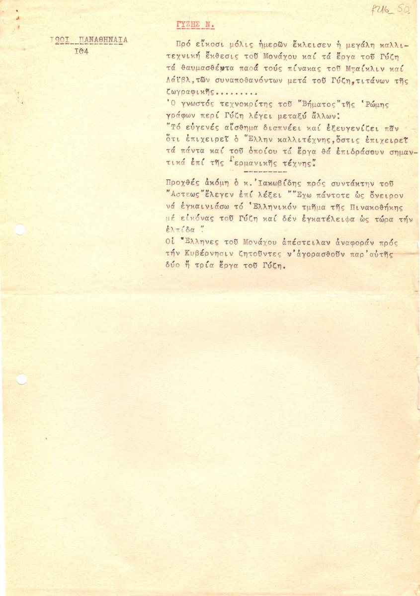 Δακτυλόγραφη αποδελτίωση άρθρου για τον Νικόλαο Γύζη. Προέρχεται από δημοσίευση στο περιοδικό “Παναθήναια”, το 1901.