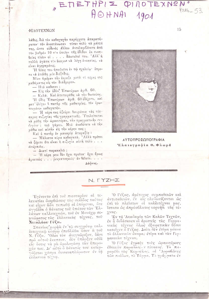Φωτοαντίγραφο, χαρτί, 2 φφ, 30×21 εκ., στα ελληνικά, δημοσίευσης κειμένου αναφερόμενου στη ζωή και το έργο του Νικόλαου Γύζη. Το απόκομμα φέρει επιγραφές.